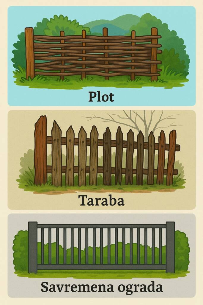 Jedno to „płot” – oznacza ogrodzenie plecione (upleteno), a drugie to „taraba”, czyli stary typ ogrodzenia z deseczek, jak widać na zdjęciu.